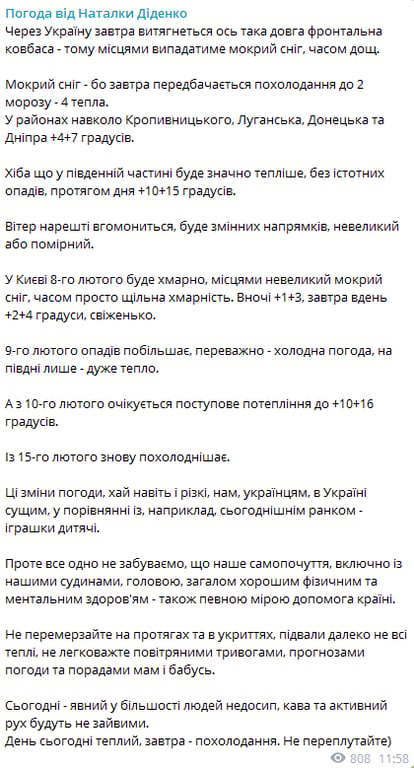 По словам Диденко, с 10 февраля в Украину придет постепенное потепления до +10...+1 6°C и будет длиться до 15 февраля — тогда опять вернется холодная погода.